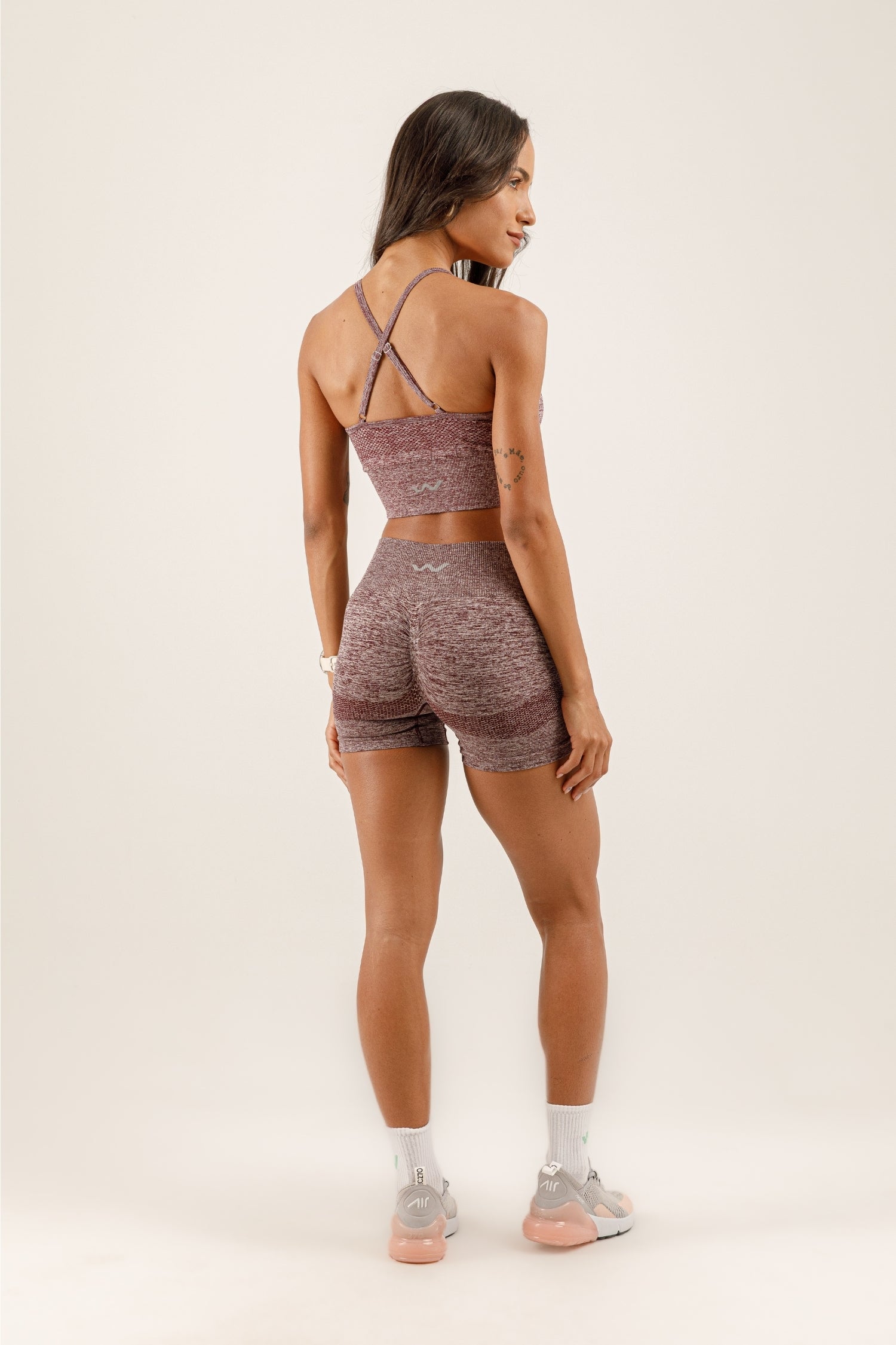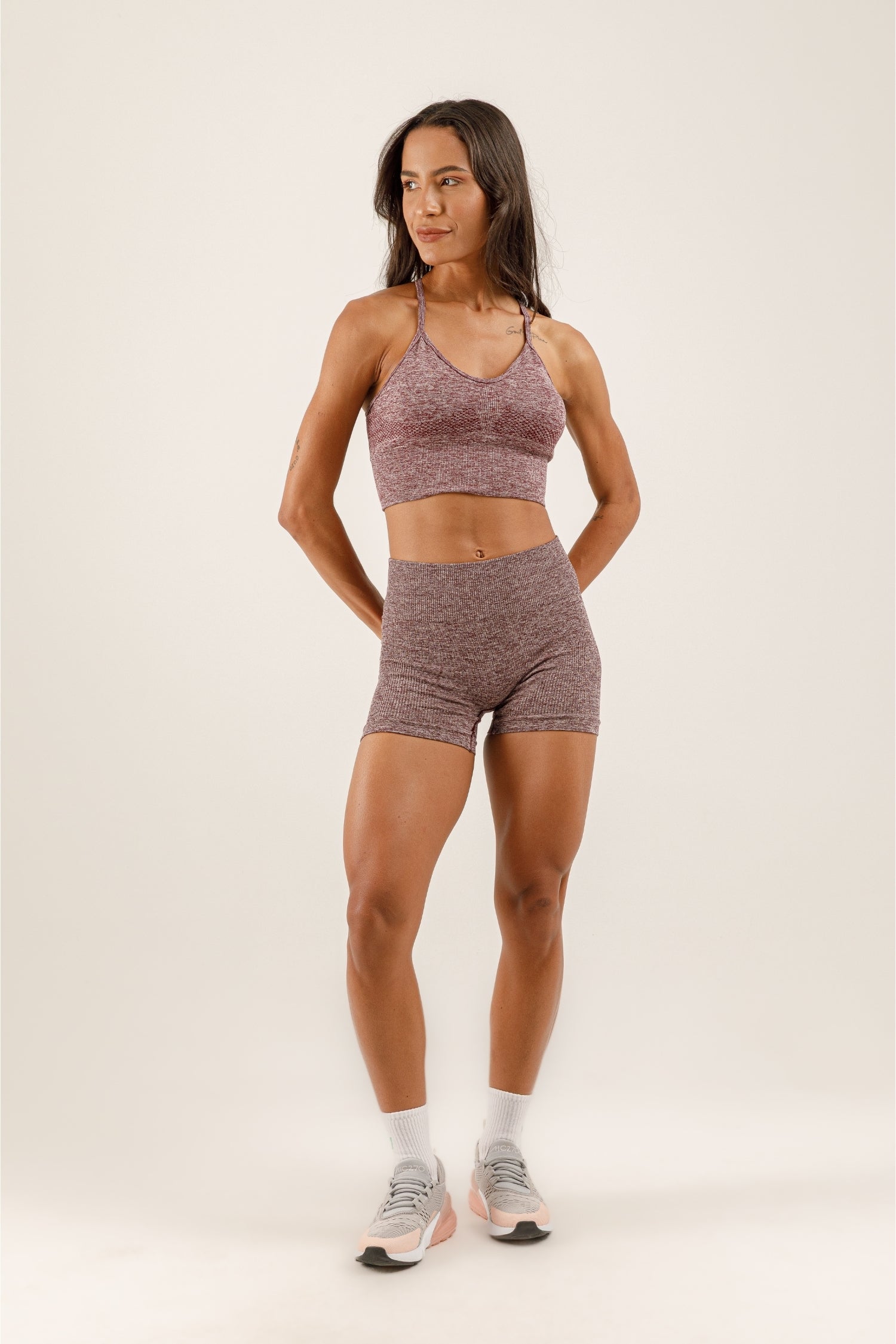 Bralet, destekleyici yapısıyla konfor sunarken modern kesimiyle şıklığı ön plana çıkarır. Kısa tayt ise yüksek beli ve toparlayıcı özelliğiyle hem rahatlık hem de estetik bir görünüm sağlar.